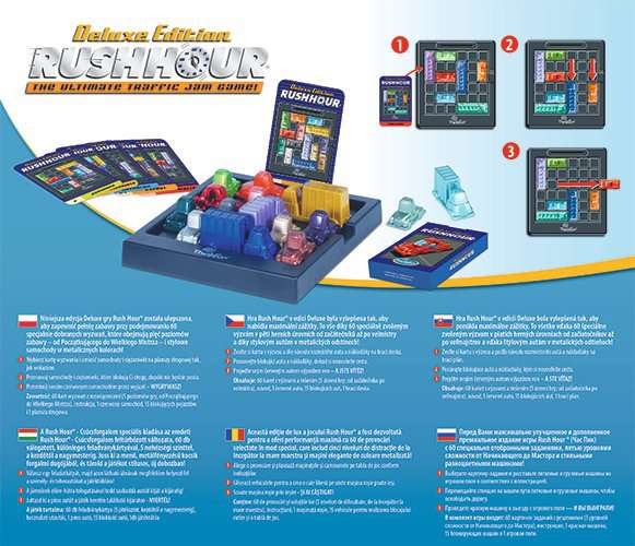 Hra Rush Hour v edici Deluxe byla vylepšena tak, aby nabídla maximální zážitky ze hry. To vše díky 60 speciálně zvoleným výzvám v pěti herních úrovních od začátečníků až po velmistry a díky stylovým autům v metalických odstínech! Posouvejte blokující auta a náklaďáky v pruzích nahoru a dolů, vpravo a vlevo, dokud neuvolníte cestu k úniku červenému autu. Vozidly lze pohybovat dopředu a dozadu, ale ne do stran.