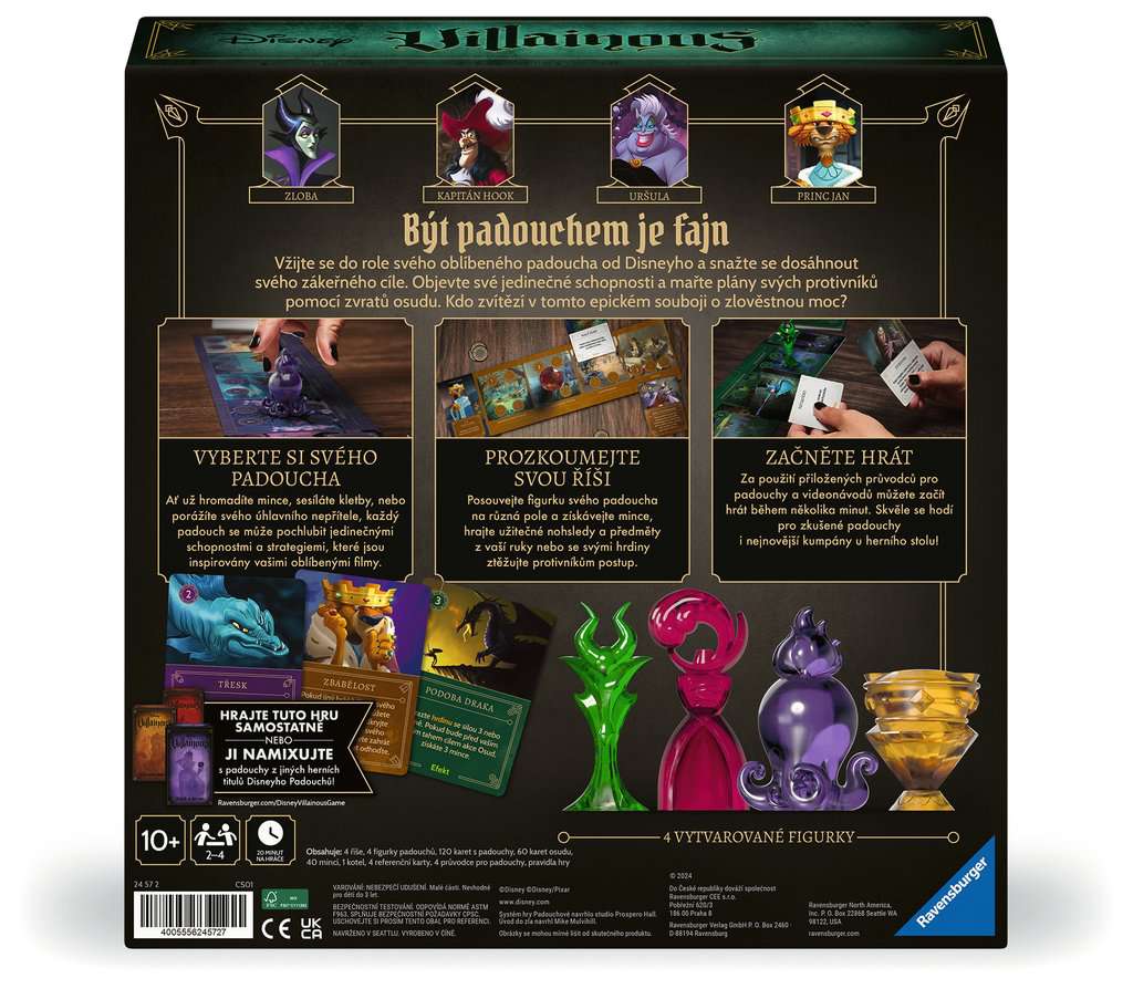 Vžijte se do role svého oblíbeného padoucha od Disneyho a snažte se dosáhnout svého zákeřného cíle. Objevte své jedinečné schopnosti a mařte plány svých protivníků pomocí zvratů osudu. Kdo zvítězí v tomto epickém souboji o zlověstnou moc? Ať už hromadíte mince, sesíláte kletby, nebo porážíte svého úhlavního nepřítele, každý padouch se může pochlubit jedinečnými schopnostmi a strategiemi, které jsou inspirovány vašimi oblíbenými filmy. Posouvejte figurku svého padoucha na různá pole a získávejte mince, hrajte užitečné nohsledy a předměty z vaší ruky nebo se svými hrdiny ztěžujte protivníkům postup.