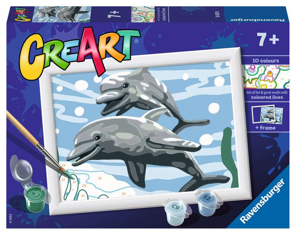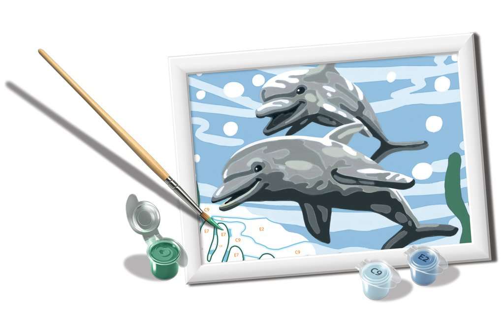 Tito veselí delfíni rozzáří každou zeď. Postupně vybarvujte jednotlivé plochy podle návodu (každé číslo na plátně odpovídá jedné konkrétní barvě) a dopřejte si radost z tvůrčí práce, u které se zabavíte na dlouhé hodiny. Malování je skvělá činnost, která nejen baví, ale také procvičuje zručnost, zlepšuje koncentraci a zaručuje spokojenost a pocit hrdosti všem umělcům. Set obsahuje vše, co potřebujete k malování: vysoce kvalitní, pevný kartonový podklad s obrazovou předlohou s očíslovanými plochami, sadu akrylových barev, štětec, kartonový stojánek pro kelímky s barvami a rámeček. Vykreslené plochy vytváří profesionálně vypadající umělecké dílo. Jakmile obraz dokončíte, nechte ho zaschnout a zarámujte ho do rámečku, který je součástí balení. Malování nikdy nebylo tak jednoduché.